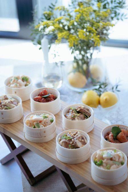 Buffet déjeuner élégant | Saumon gravlax, risotto de légumes au parmesan, tataki de bœuf aux herbes |